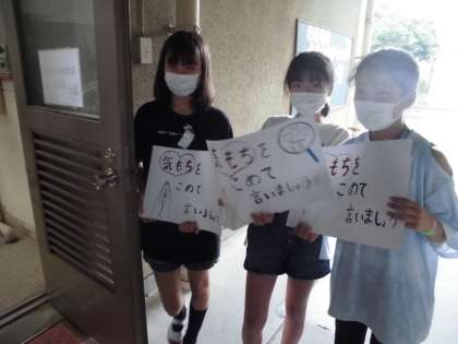給食室前で笑顔で声を掛けてくれることで,給食当番も最後まで一生懸命頑張っています。
