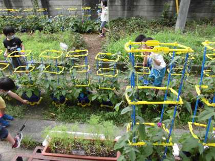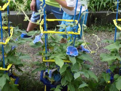 アサガオが次々と花を咲かせ,子どもたちを楽しませてくれています。しっかり雨が降った後で水やりの必要がない日でも,「アサガオを見てきます。」と嬉しそうに観察に出かけていきます。プランターに植えたコスモスも丈が長くなってきました。