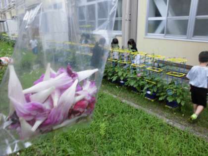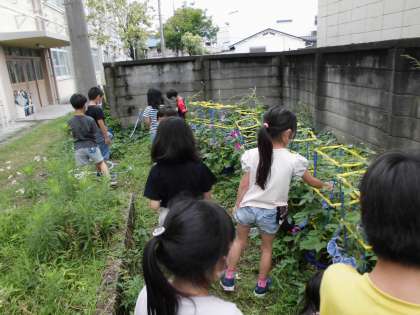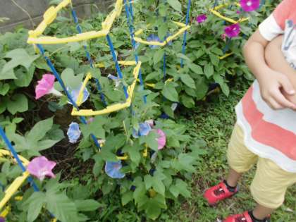 毎日たくさんのアサガオの花が咲くので,みんなで観察に行き,色水遊びのために咲き終わってしぼんだ花を集めに行きました。