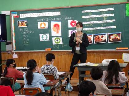 栄養教諭の木原先生に食育指導をしてもらいました。いろいろな感覚を使って楽しむ食事について考えました。料理のおいしさが伝わるように食レポをする活動などもあり,子どもたちは楽しみながら学習に参加していました。