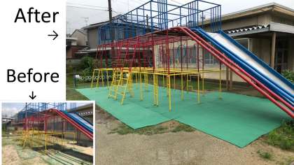 総合遊具の下に敷いていた緩衝材のマットが古くなっていたので,新しくしました。