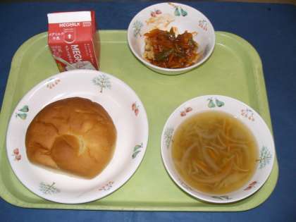 新献立「あじのケチャップあんかけ」は、あじにしょうがとしょうゆで下味をつけて油で揚げました。あんにはたまねぎ、にんじん、たけのこ、三度豆を使い野菜の歯ごたえを味わえるように調理しました。子どもたちの大好きなケチャップ味なのでパンにもよく合い好評でした。