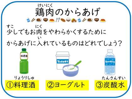給食のからあげは,安全安心のためにしっかりと鶏肉を揚げますが,しっかりと揚げれば揚げるほど肉は固くなってしまいます。お肉をやわらかくするために鶏肉のからあげに加えているものは何でしょう?