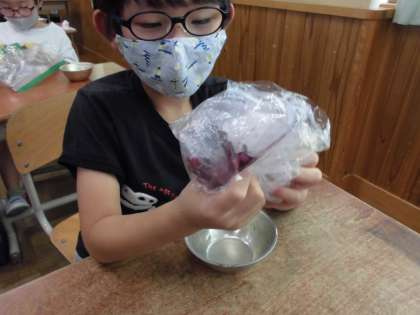 夏休みの間に冷凍しておいたアサガオの花を使って色水遊びをしました。まずは自然解凍された花を袋の上からもみもみ。きれいな紫色の汁がじわじわと出てきます。