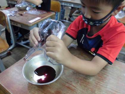 十分にもんだ後は,容器の中に色水を移し,準備完了です。