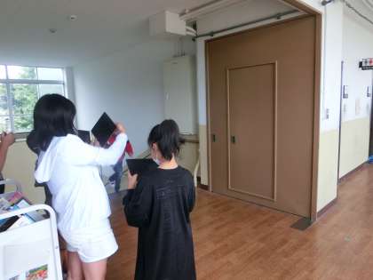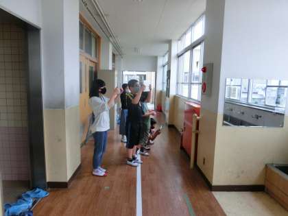 社会の学習で,学校の中の災害から生活を守るための設備を探しました。