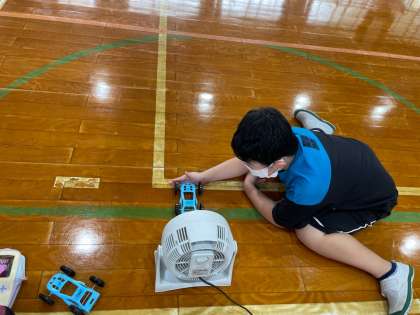 理科の学習で風の力の学習をしました。「風の強さで車が進む道のりは変わるのか」といいう課題意識をもって実験にのぞみました。楽しみつつも子ども達にはいろんな気付きがあったようでした。