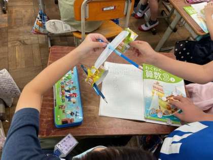 算数の「重さ」の単元の学習を進めています。今回は「g(グラム)」という新しい単位と「1円玉=1g」ということを知りました。そして,1円玉が1gであることを利用し,身の回りの様々な物の重さを量りました。子ども達はいろんな重さを楽しんで量りつつも,重さを数値化できる便利さに気付いていました。。