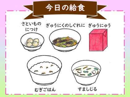 麦ごはん・牛乳・牛肉のしぐれ煮・里いもの煮つけ・すまし汁でした。