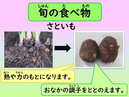 9月の和献立は,お月見に食べたり,お供えしたりする“里いも”を使ったメニューでした。里いもはこの時期にたくさん収穫でき,そのことからお月見のことを別名“芋名月”ともいいます。里いもやお団子をお供えしたり,食べたりすることで感謝の気持ちを伝えるというのがお月見だそうです。今年のお月見は9月21日です。きれいな月が見られるといいですね。