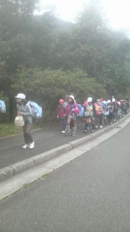 5年生は,無事に山の家に到着しました。現地は,うっすらと霧がかかり,市街地よりは少し気温が低いようです。入所式を終え,おうちの方に作っていただいたおむすびをいただきます。