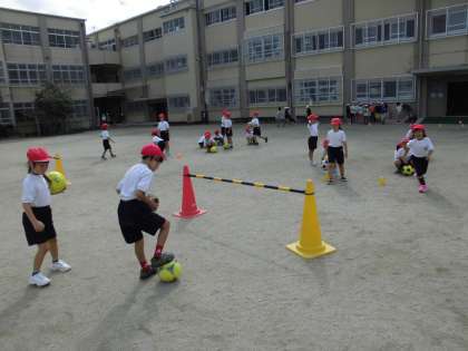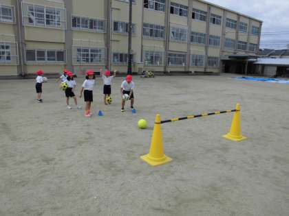 ボールを蹴って相手にパスをする練習をした後に,ゴールめがけてシュートをする練習をしました。最初のうちは慎重になりすぎて,蹴った球が弱弱しく転がっていったり,ねらいが定まらずゴールから外れてしまったりすることが多かった子どもたち。慣れるにしたがって,強い球を正確にゴールの中に蹴ることができるようになってきました。