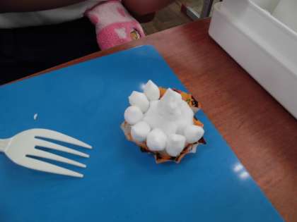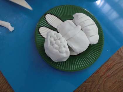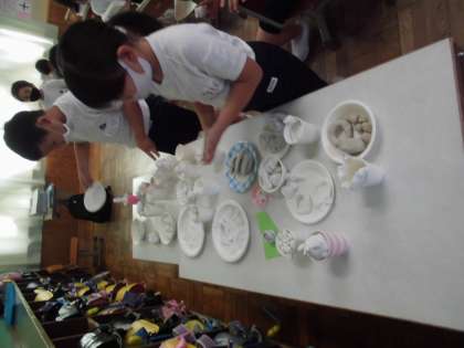 食べ物を粘土で作り,紙皿や紙コップに盛り付けてパーティーの始まりです。