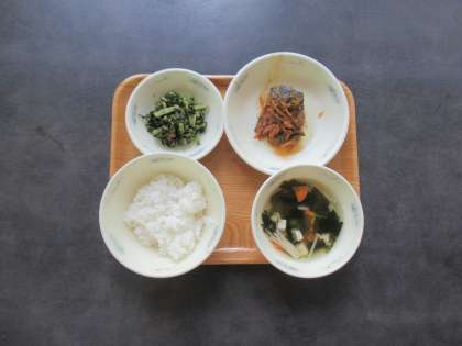 ごはん・さばのみそ煮・だいこん葉のごまいため・五色のすまし汁でした。