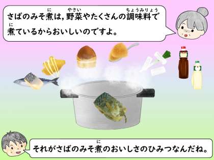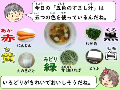 “さばのみそ煮”はさばの他にも,今の時期が旬のしょうがやこれからの時期においしくなる白ねぎを使っています。和献立の日には,子どもたちにその月の和献立に関する動画を見てもらっていますが,今回は動画を通じてさばのみそ煮のおいしさを子どもたちに伝えました。また動画では,和食において大切にしている5つの色についても取り上げてました。