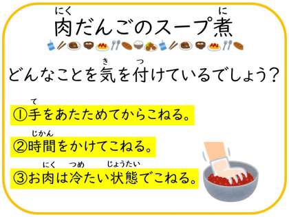 おいしい肉だんごを作るために,こねるときに給食調理員さんが気を付けていることがあります。さて,どんなことに気をつけているでしょうか?