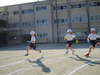 体育発表会80m走。低学年までの直線コースを卒業し,コーナーを曲がって,長い距離を走りました。