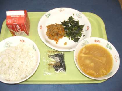 給食では「信州みそ」「赤みそ」「白みそ」の三つの米みそを使っています。味噌には消化しやすいたんぱく質が多く含まれています。
