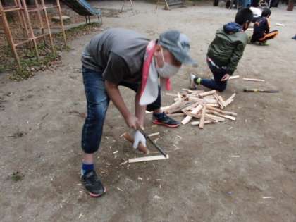 初めて使う“なた”を安全に使い,大きなけがなく上手にまきを割っていました。