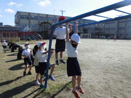 てつぼう遊びは1学期にしましたが,「うんてい」を使って遊ぶのは初めてという子どももいました。てつぼう遊びの時に学習した通り,落ちにくいようにしっかりと親指をかけてはしごをにぎります。うまく両手でぶら下がったらスタートです。右手左手…と順番に手を変えて進みます。一本ずつ慎重に進む子もいれば,一本とばしでぐんぐん進む子もいます。端から端までスイスイ進む子もいれば,ぶら下がったものの,つぎの手がなかなか出ない子もいます。自分の力に合わせて,もっと遠くにもっと早くたどり着けるように頑張っています。終わった後は「手が痛い〜」「まめができた〜」と赤い手を見せていました。