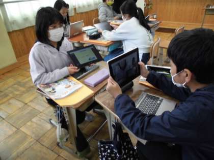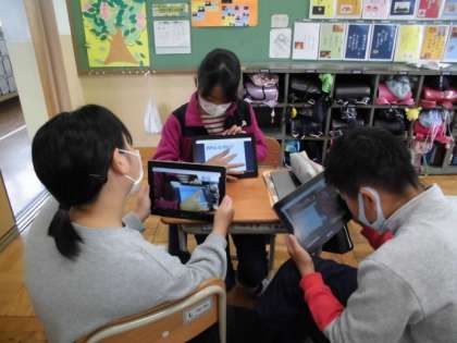 そしてこの日は,タブレットの録画機能を使って動画をとり,“自分の発音を確認して,もう一度話してみる。”という学習も行いました。初めて聞く自分の英語の発音に,恥ずかしそうにしたり,もっとうまく言えるように改善したりしている姿が見られました。