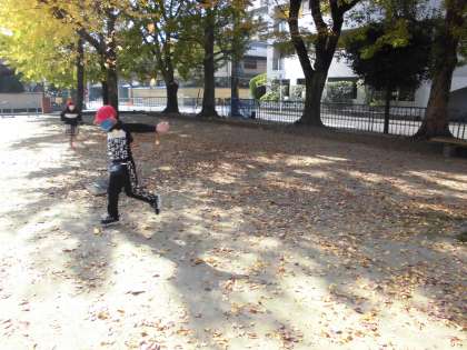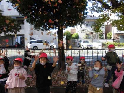 きれいな色の落ち葉を選んで拾っている子どももいましたが,落ち葉のじゅうたんの上を走ったり,拾い集めた落ち葉を空に向けて放ってシャワーにしたり,落ち葉の遊び方もいろいろです。