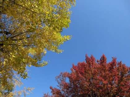 気もちのいいお天気で,「先生,信号みたい!」といった子どもが指さした空には,赤(赤い葉)・青(青空)・黄色(イチョウの黄色い葉)が確かに並んでいました。