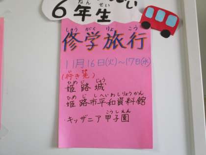 明日からいよいよ6年生は修学旅行で姫路・神戸方面に出発します。南校舎1階の図書館だよりのボードには,修学旅行で訪れる姫路城や姫路市平和資料館,そしてキッザニア甲子園に関係する書籍を紹介するコーナーが特設で設けられています。世界遺産の姫路城について,戦争関係や平和について,はたらくことについての本が置かれています。手に取って読んだ人も多いでしょう。事前学習で学んだこと,読書で知ったことを現地で実際に見聞してより深い学びにつなげてほしいと思います。