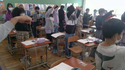この時間は,一人一つのふりこをもって曲に合わせて,ふりこを動かしました。
