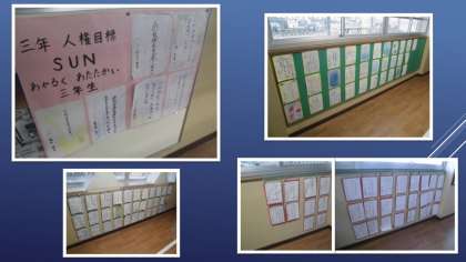 校長先生のお話を聞いて,人権について考え,これから大事にしたいことを紙に書きました。教室前に掲示し,日々の生活を振り返ったり,友達の考えに触れ,自分の考えを広げたりしました。
