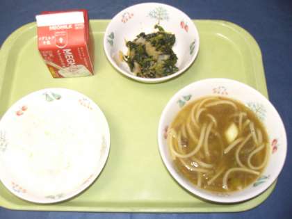 「カレーうどん」は、昆布と削り節で出汁をとり、牛肉、たまねぎ、白ねぎを入れて美味しいカレーうどんの出汁を作ります。今日はいつもより量が多かったのですが、完食してくれました。