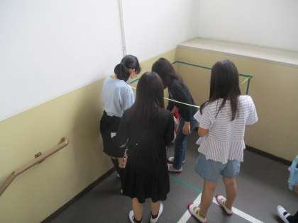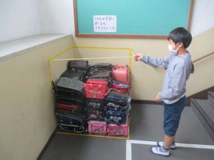 「体積」の学習を進めている子どもたち。この日は,階段のスペースに「1立方メートル」を作り,その大きさを実際に体験する活動を行いました。中に入って,「私の家のお風呂よりも・・・」と大きさを比べたり,クラス全員のランドセルを並べて,「まだまだいける!全部で45個はいける!」と話したりして,その大きさを実感していました。