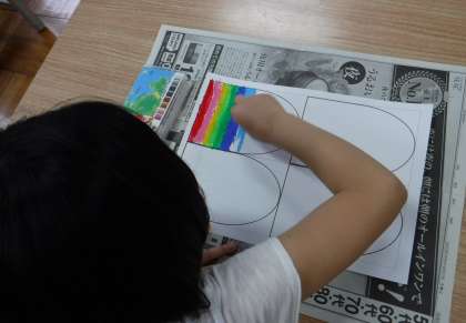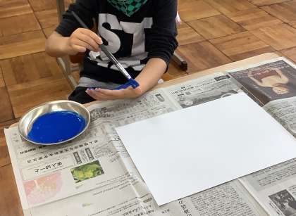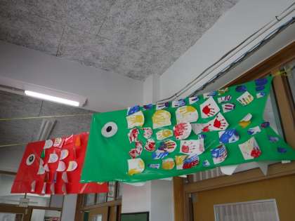 子どもの日に合わせて,4月26日,27日にこいのぼりを作りました。うろこに思い思いの絵を描いたり色を塗ったり,手形を押したりして作りました。教室前の廊下で気持ちよく泳いでいます。