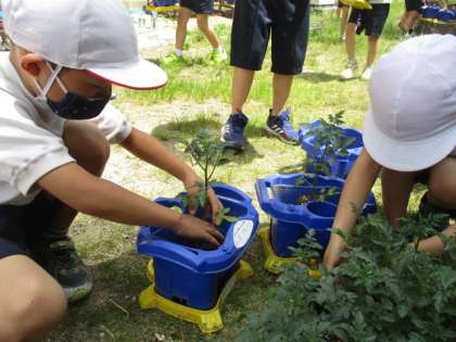 去年のアサガオは種から,チューリップは球根から育てたので,苗を鉢に植えるのは初めての子どもたち。ポットから苗を出すだけでもドキドキです。苗を傷めないようにそっと持ってから逆さにし,ゆっくりと取り出し,大事そうに鉢に置いていました。