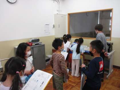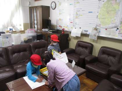 部屋に入る時と部屋を出る時に挨拶をすること,1年生が持っている地図に行った場所のシールを貼る手助けをすること,トイレに行きたくないか聞いてあげること,そして,行った部屋がどういうところなのか説明をすること,2年生はやることがいっぱいです。