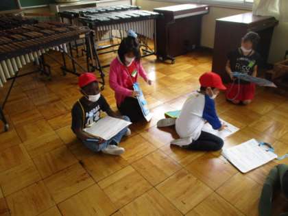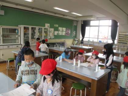 3階は音楽室と理科室です。音楽室は1年生の時に何度も利用しているので,2年生は得意げな様子で説明していました。1年生がそれぞれの部屋で見つけたものをカードにメモするのを助けている2年生がたくさんいました。やさしく教えている姿が素敵でした。