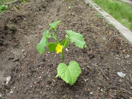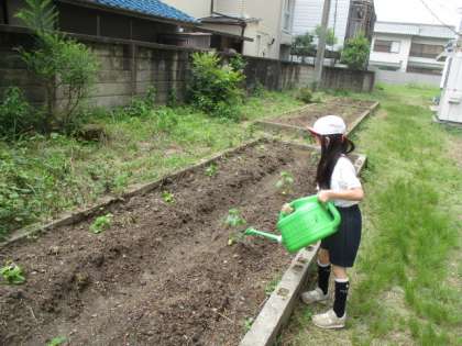 キュウリにも花が咲いていました。水やりは,日直さんの仕事です。大きなじょうろに水を入れると重たいですが,みんなのために頑張ってくれています。