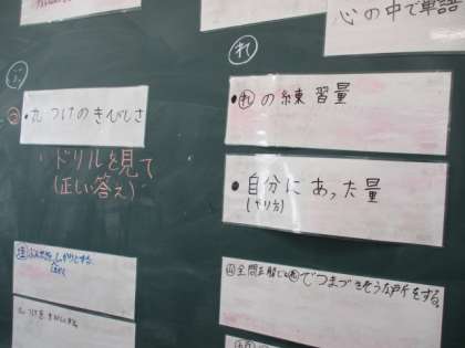 2つ目は,週1回の小テストに向けて取り組んでいる「漢字」のノート。振り返りシートをもとに,よい点数が取れる学習の共通点を出し合いました。