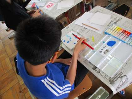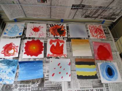 そんなやりとりから始まった学習。子どもたちは色と形,筆使いを工夫して自分の心のもようを表現していました。