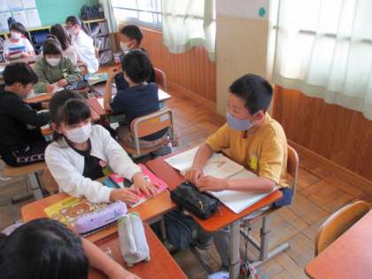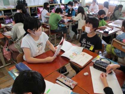 「インタビュー名人になろう」を目標に,インタビュー活動を何度か繰り返しました。いちばんの学びは,「聞き手と話し手がチームになって進めること」聞き手の意図を読んだり,話し手が気持ちよく話せるように相槌をうったりなど,二人がチームになって深めることが大事だと学ぶことができました。