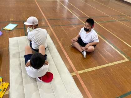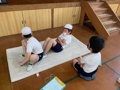 新体力テストで「上体起こし」を行いました。日常ではあまりしない腹筋を鍛える動きですが,30秒間頑張ってやりきりました!記録が何回だったのか,ぜひお家で聞いてみて下さい。