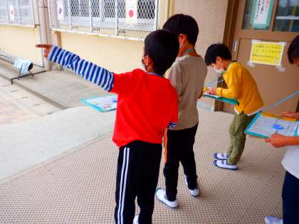 社会科の学習で,学校の東西南北を調べました。「東の森は東にあるから,この名前がついていたのか!」「東校舎と南校舎と西校舎はあるけれど,北校舎はないよ!」など,方位と場所について,たくさん気付くことができました。子どもたちは,方位磁針と地図を持ちながら,意欲的に調べていました。