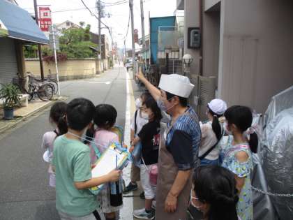 パン屋さんでは,毎日焼くパンの数や,お客さんの人数などをインタビューしました。朝の3時半ごろからお店の準備をしていることを聞き,声をあげて驚いていました。帰りには,吉祥院商店会のロゴに隠された秘密を教えてもらいました。