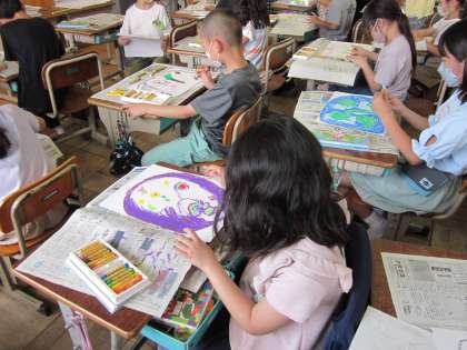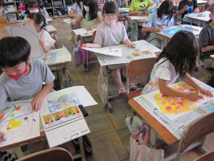今日はたまごを画用紙に描きました。たまごが仕上がれば,そのたまごを割って(切って),割れたあとに広がる世界を描いていきます。自分の世界を表現するために,思い思いのたまごを夢中になって描いていました。