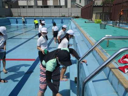 足洗い場やシャワー周り,プールサイドの草抜きから始まり,最後にはプールの中をみがいていきました