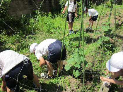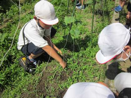 野菜の苗が太陽の光をいっぱい浴びてすくすくと成長してきました。それに負けじと畑の雑草たちも元気いっぱい育ち,野菜の苗を隠す勢いです。今日は,野菜のために雑草抜きをしました。時々姿を見せるテントウムシやアゲハチョウに心を奪われながらも,頑張って抜いてくれました。