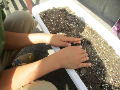 生活科で,1年生の畑にひまわりを,各クラスのプランターに6種類の花の種をまきました。これからあさがおと一緒に育てていく予定です。たくさん花が咲いてほしいです。
