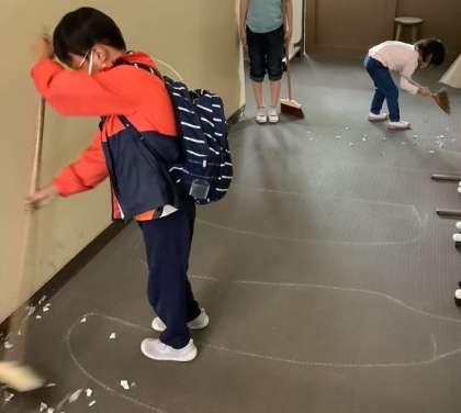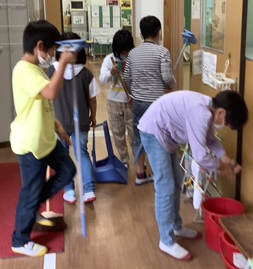 みんなで協力してすみずみまできれいにしています。高学年の掃除の仕方をお手本にして,1年生もじょうずに掃除ができるようになってきました。