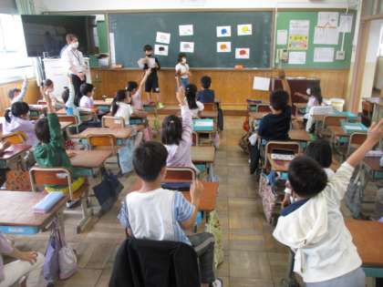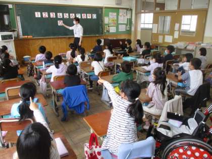 数字や色,体の部位など,1年生のときに学習したことを思い出して使いながら,体を動かしたり,先生の言う言葉を注意深く聞いたりして,ゲームを楽しみました。また,子どもたちが前に出て,先生役をする場面もありました。みんな,楽しく,一生懸命に取り組んでいました。