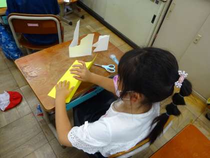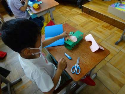 切ったり,かき加えたりしながら動物や乗り物などを作りました。